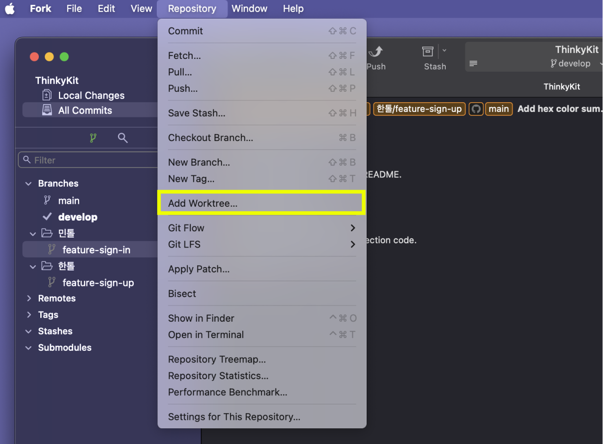 이를 위해 각각의 worktree를 생성해 보겠습니다. 상단 Dock에서 Repository > Add Worktree...를 클릭합니다.