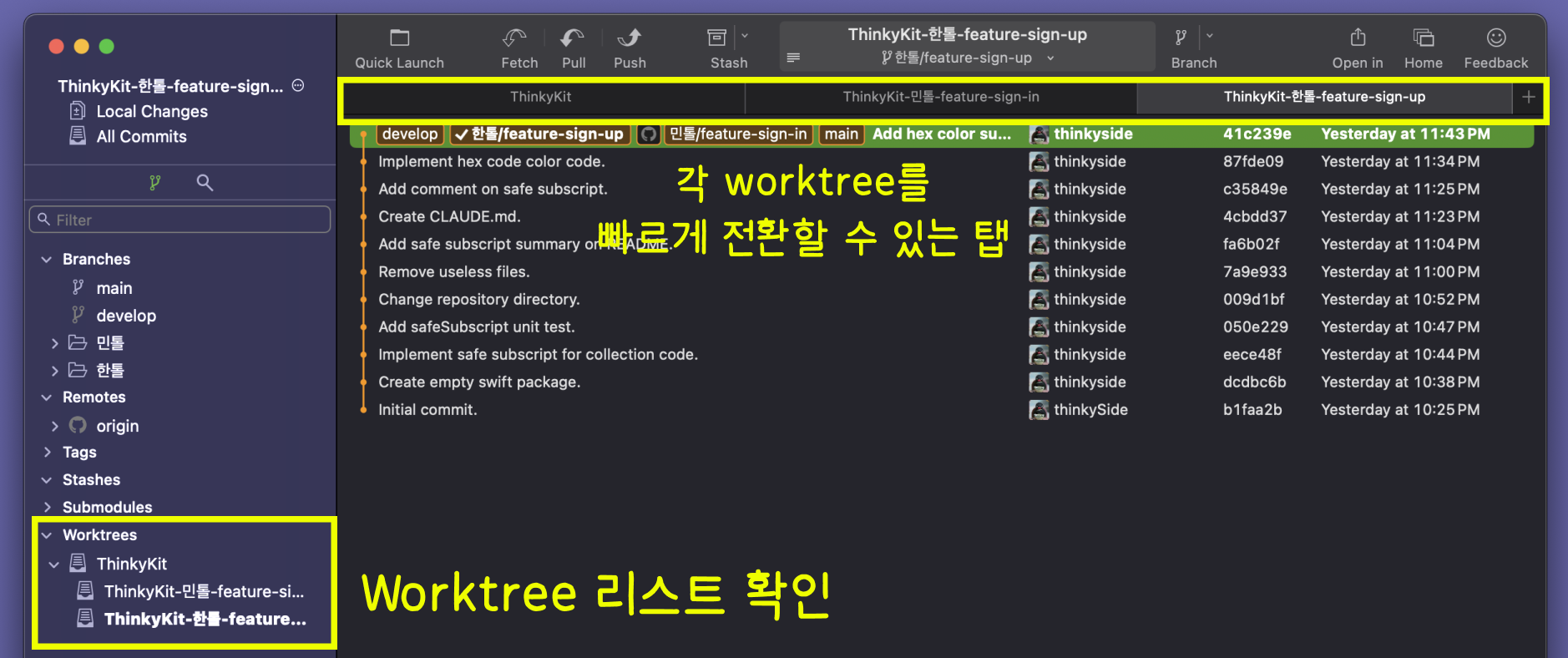 이렇게 각각의 branch를 worktree로 생성하면 다음과 같이 UI로 확인할 수 있게 됩니다.