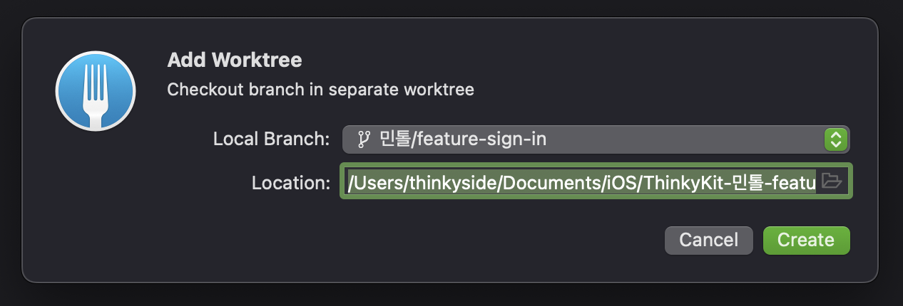 이후 Add Worktree Alert 창이 출력되는데, 여기서 Local Branch에 기준으로 삼을 branch를, Location에 디렉토리명을 입력 후 create 합니다. 위에서 살펴봤던 `git worktree add {path} {branch}`와 같은 동작입니다.