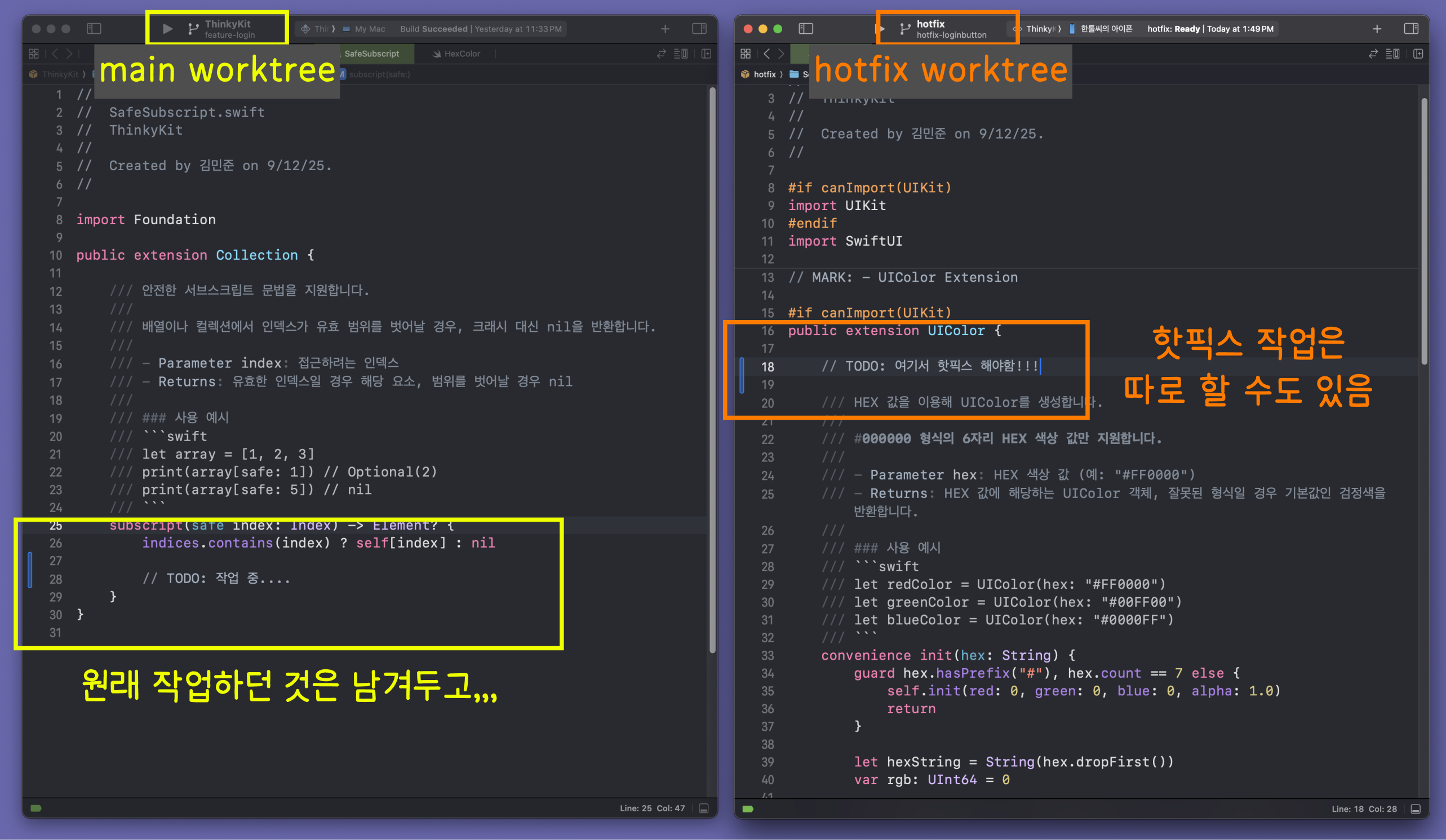 새로운 문제(?)라면 worktree 덕분에 여러 개의 Xcode를 띄워놓을 수 있게 됐는데 빌드를 여러 개 돌리다 보면 맥북이 죽으려 한다는 것,,,? 정도 말고는 아주 좋은 경험이었습니다.