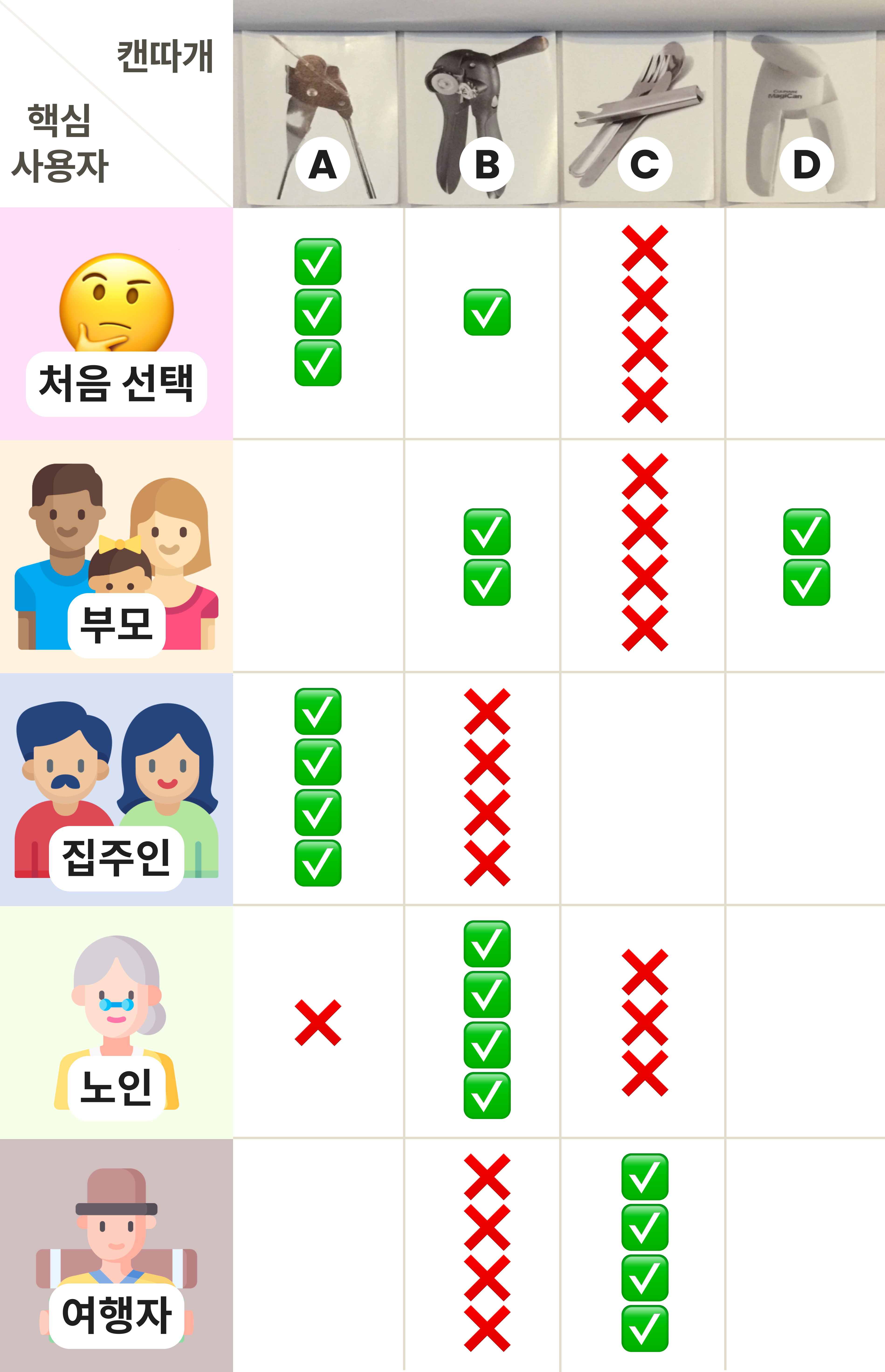 이러한 방식에 골머리를 앓던 당신은, 캔따개 시장의 80%를 책임지는 핵심 사용자 4가지 그룹의 사용자 연구를 진행했습니다. 평가 규칙을 바꿔서, 각각의 사용자 그룹에게 가장 사용성이 좋은 제품과 나쁜 제품을 결정해야 합니다!