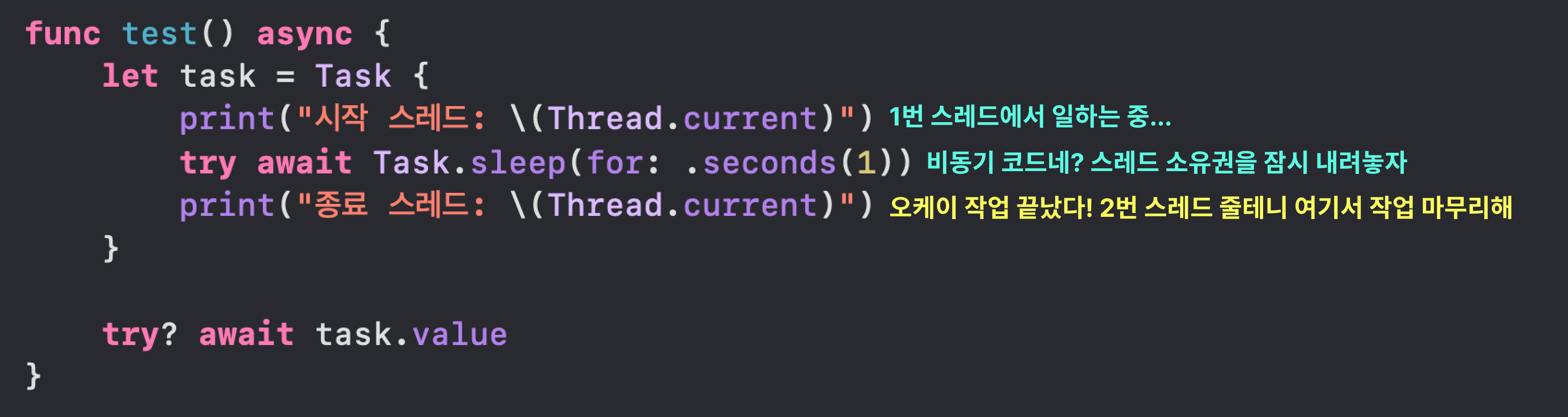 즉, Task 안의 모든 코드가 같은 스레드에서 실행되지 않을 수 있음을 항상 인지하고 있어야겠습니다.