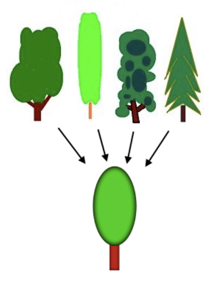 만약 A가 B의 일반화 개념이라면, 개념 B의 모든 사례가 개념 A의 사례라고 합니다. 아래 이미지의 4가지 나무에서 공통된 개념을 추출해 최종 나무를 만들어내는 과정을 '일반화'라고 할 수 있습니다.