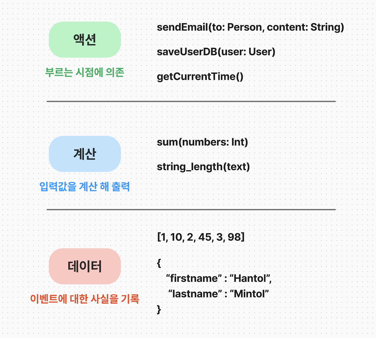개인적으로 함수를 제대로 설계하는 것이 리팩토링의 가장 작은 기본 단위이지 않을까 생각합니다. 좋은 함수를 설계하는 방법은 다양하지만, 제가 경험한 가장 직관적이고 적용하기 쉬운 개념을 설명드리려 합니다. 에릭 노먼드의 ‘함수형 코딩’에서는 코드를 3가지 분류로 나눌 수 있다고 이야기합니다.