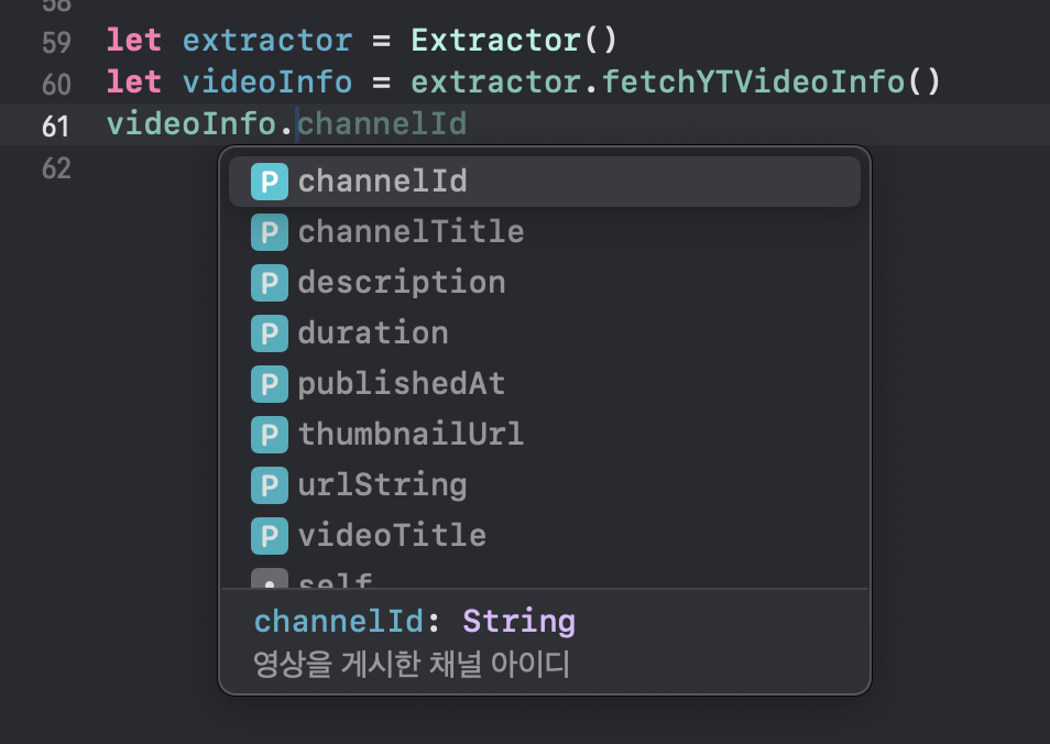 모듈 외부에서 YTVideoInfo 를 반환하는 함수를 사용해 영상 제목을 받아오는 예시입니다. YTVideoInfo 라는 이름 자체에서 알 수 있듯, 비디오 정보를 반환하는 목적의 객체로 개발자는 자연스럽게 도메인에 필요한 속성들을 찾게 됩니다.
