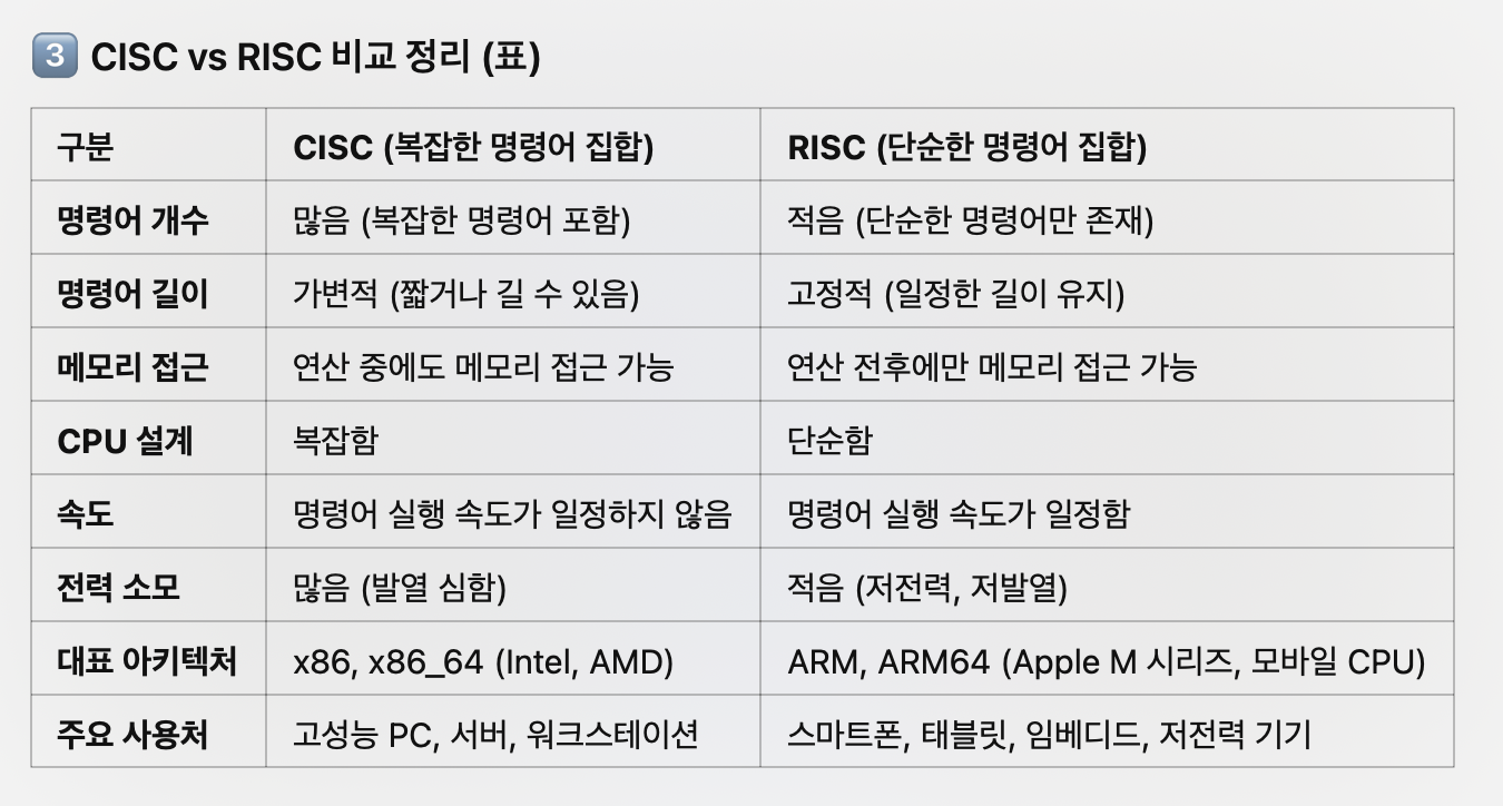 - 단점: 명령어가 길고 복잡해 CPU 설계가 어려움 / 전력 소비가 높고 발열이 심함 / 성능 최적화가 어렵고 실행 속도가 일정하지 않음