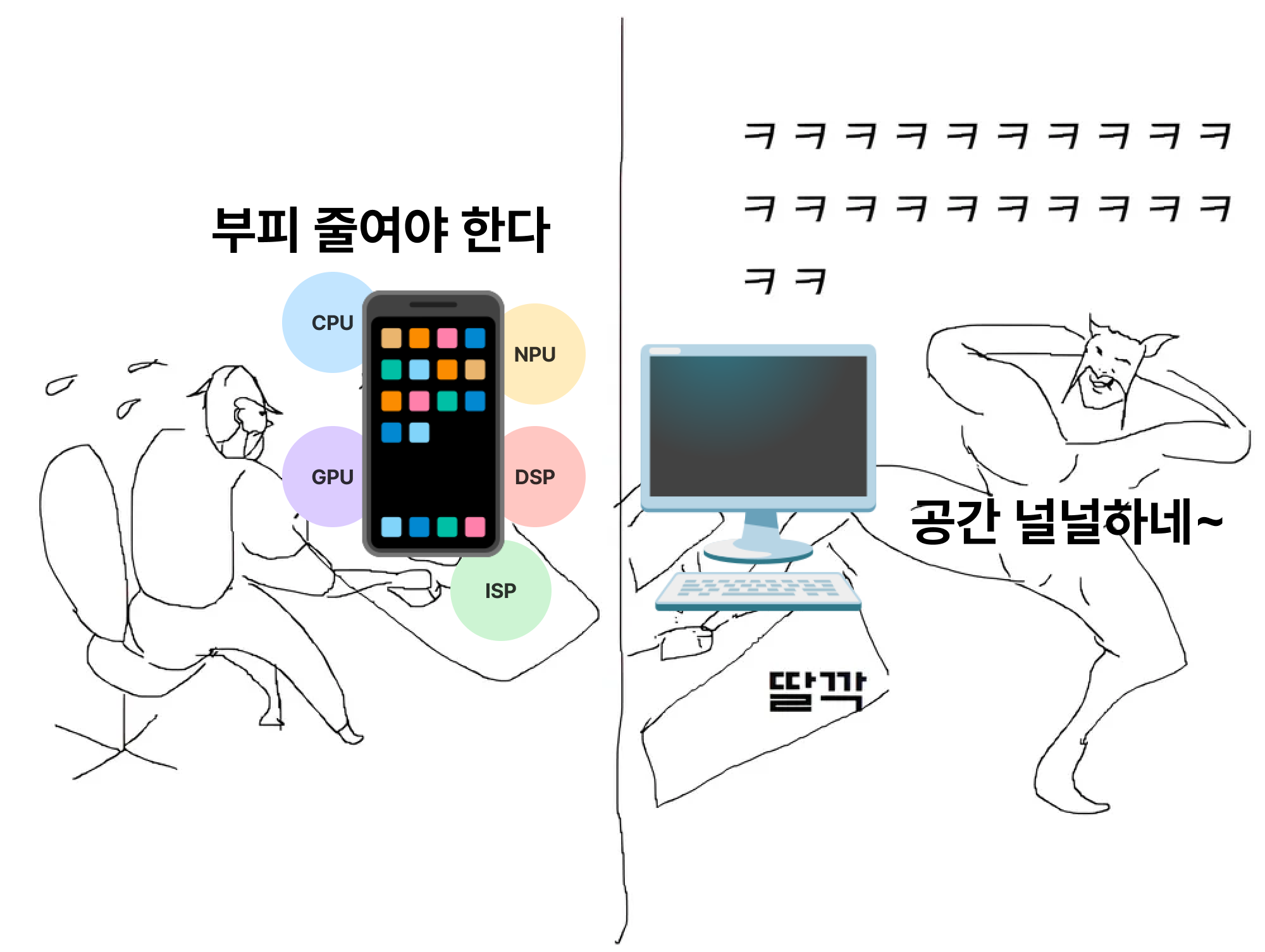 AP는 쉽게 말해 CPU 역할만 하는 것이 아닌 모바일 환경에서 필요한 다양한 연산과 처리를 수행하는 핵심 프로세서의 역할을 수행합니다. 컴퓨터는 내부 크기가 스마트폰에 비해 널널하기 때문에 부품 크기에 제약을 상대적으로 덜 받습니다. 하지만 스마트폰의 경우 부피를 줄이는 것이 중요하기 때문에 다양한 역할을 한 칩으로 줄여야만 하는 것이죠!