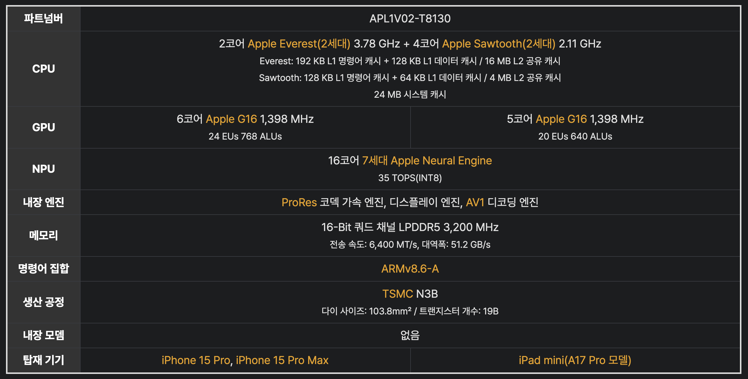 애플의 대표적인 AP는 A시리즈 입니다. 제가 사용 중인 iPhone 15 Pro에 탑재된 A17 Pro는 아래와 같은 구성 요소로 이루어져 있습니다.
