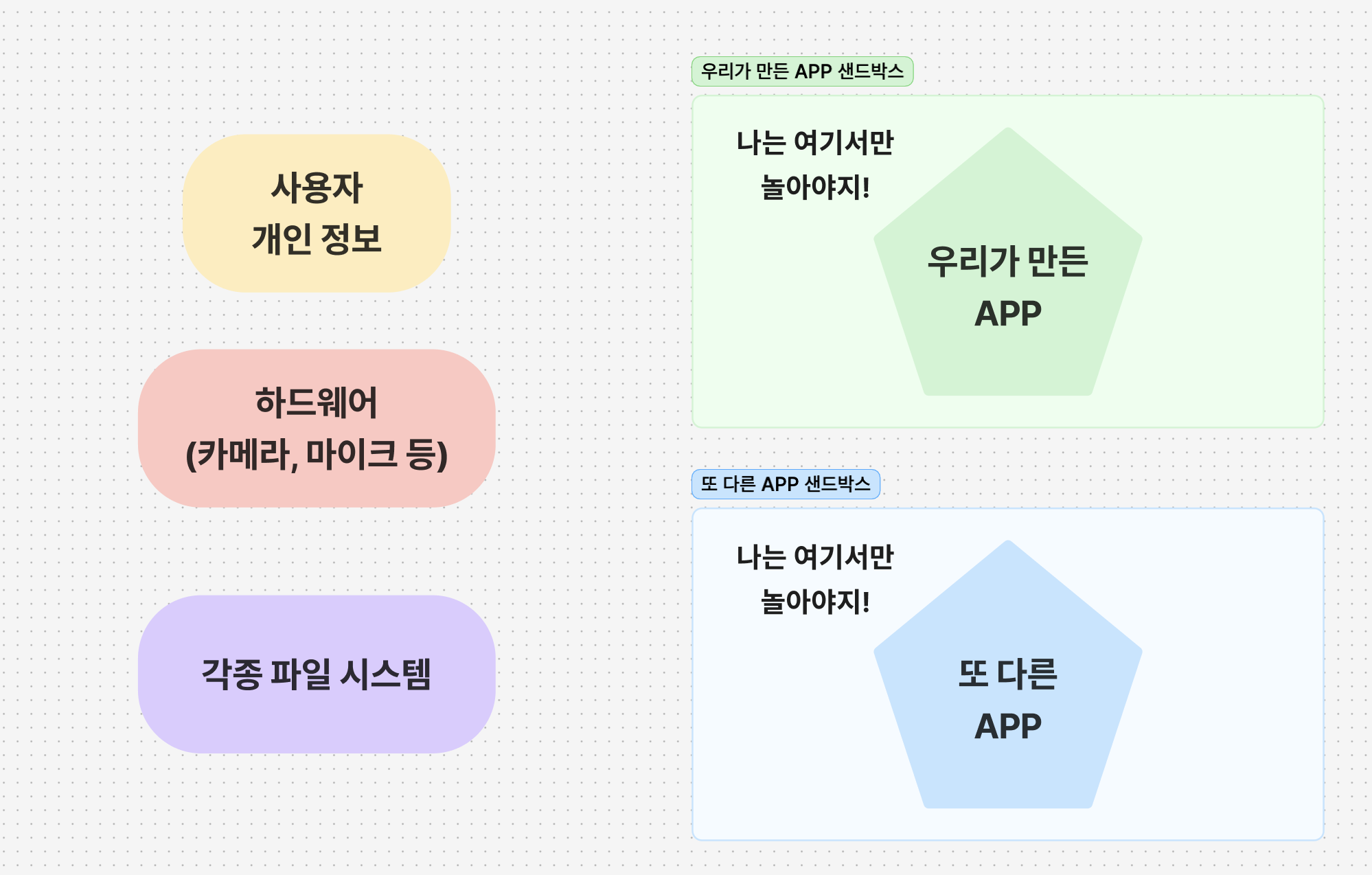쉽게 말해 아이들이 다칠까봐 모래 상자 안에서만 놀게 하는 것처럼, 특정 앱이 제한된 공간 내에서만 동작하도록 만든 시스템이라고 생각할 수 있습니다.