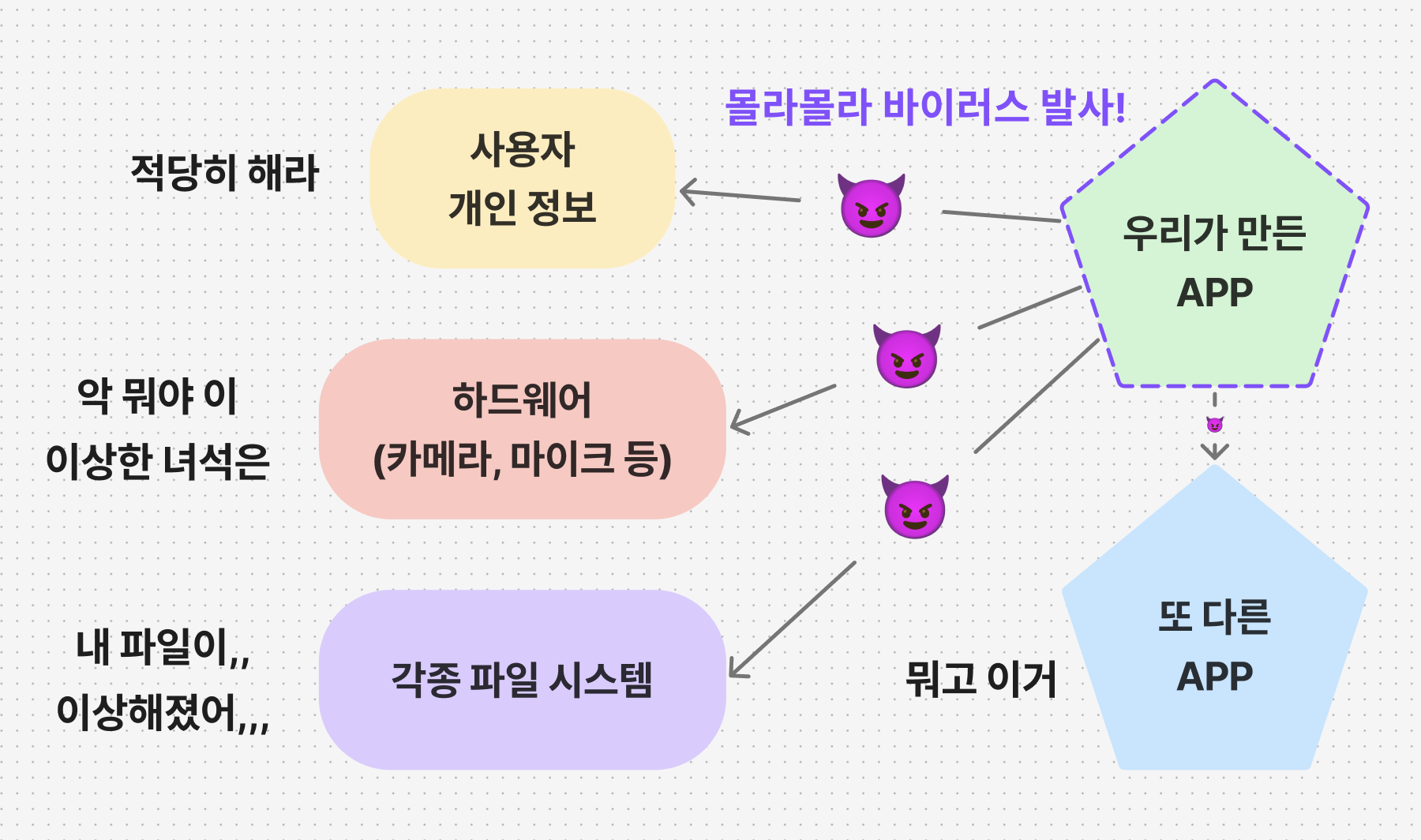 하지만 만약 우리가 만든 APP이 손상되었다면 어떨까요? 악성 코드나 해킹을 당했다던가, 충돌이 난 데이터를 다른 시스템에 영향을 주는 상황을 말이죠. 아마 우리의 핸드폰은 엉망진창이 될 지도 모릅니다.