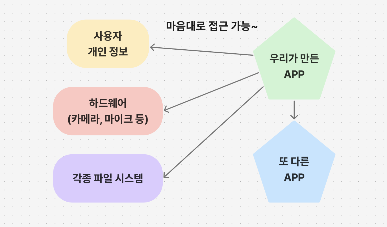 샌드박스는 어떻게 제한된 공간 내에서만 동작하도록 만들 수 있을까요? 우선 샌드박스 없이 앱이 설치된 상황을 예시로 들어보겠습니다. 우리가 만든 APP은 사용자의 개인 정보, 하드웨어, 각종 파일 시스템 심지어 또 다른 APP 데이터에도 접근할 수 있을 것 입니다. (굉장히 편리하고 다양한 서비스를 제공할 수 있을 것 같아 군침이 돕니다.)