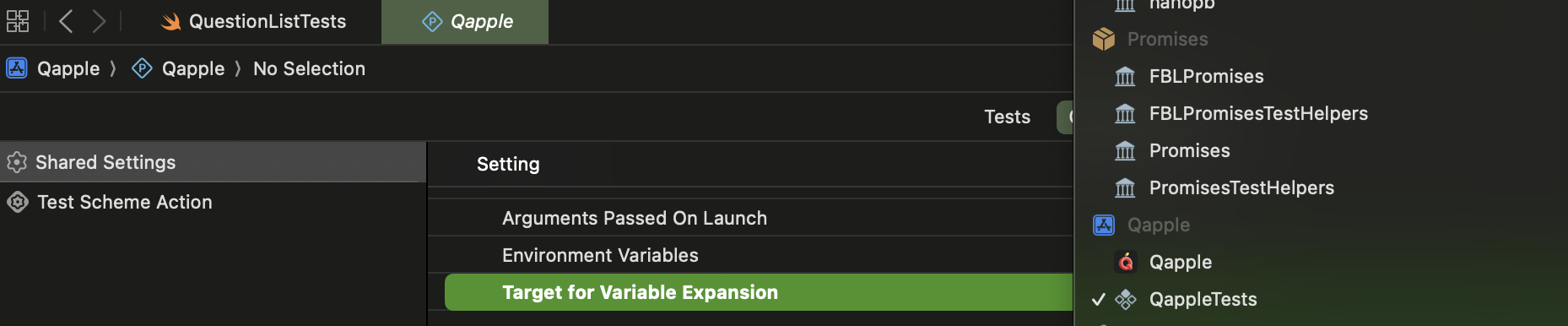 Autocreated 된 TestPlan에 아무것도 안떠 있길래 상단의 `Configurations` 탭에 들어간 후 `Target for Variable Expansion`을 메인 타겟에서 UnitTest 타겟으로 바꿔줬습니다.